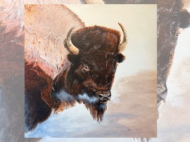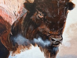 This beautiful painting captures a frosty winter moment on the north road in Yellowstone National Partk's Lamar Valley, where artist Jason Poole was approached in his jeep by a bison, as if the grand animal was checking his hair in the side mirror. "I was so stunned that I almost forgot to take a picture," said Poole.