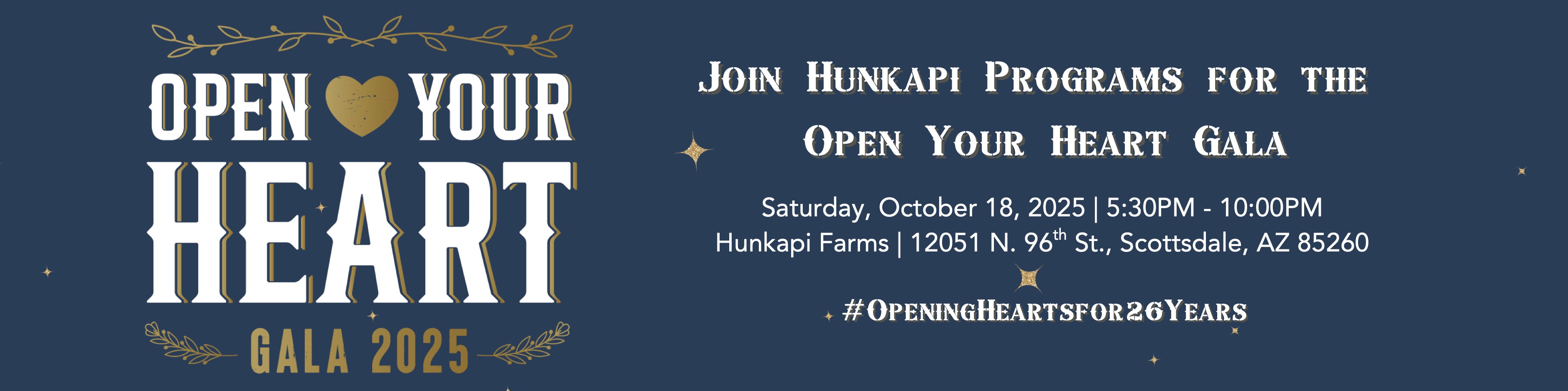 Join Hunkapi Programs in celebrating 26 years of service at our annual "Open Your Heart Gala" at our very own farm on October 18, 2025!