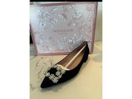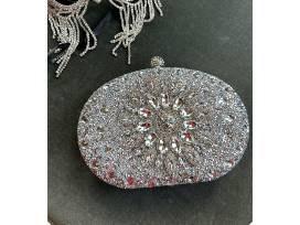 Complete your elegant evening attire with these stylish accessories: Designer evening shoes, size 38, black with rhinestone buckles, a silver and rhinestone evening bag, and a metal cell phone holder.