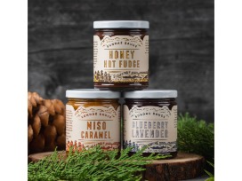 One of each of the signature Sugarpine Sundae Sauces -- Blueberry Lavender, Miso Caramel, and Honey Hot Fudge.