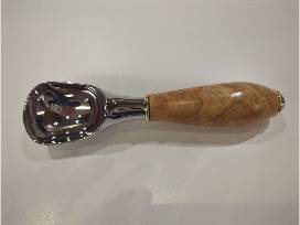 Scoop your Ice Cream with elegance and flair with this handsome Hand-made Scoop. The attractive chrome plating will complement any kitchen and includes a convenient thumb rest for easier scooping. The two decorative brass washers provide a beaded appearance.