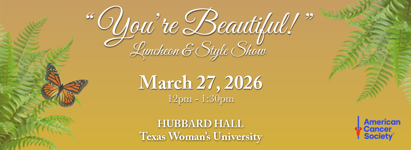 The 2026 annual "You're Beautiful!" Luncheon and Style Show will be held on Friday, March 27, 2026, at Hubbard Hall on the campus of Texas Woman's University. We couldn't be more excited, and we hope you are, too. Your participation in, and support of this staple Denton event benefits local cancer patient services, research, education, and advocacy. As in past years, we have a multitude of underwriting options. Underwriters at the Platinum level and above are invited to a champagne reception on the day of the event. The luncheon consists of a style show of local cancer survivors modeling fashions provided by local retailers. Headway has been made in cancer survivor rates, but there is still much to be done. We hope you will continue to join us in raising money to fight cancer in Denton! "You're Beautiful!" is an important Denton event and for such a great cause! We look forward to seeing you in March.