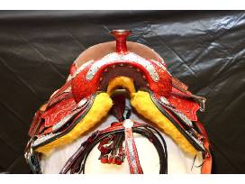Ornate leather horse saddle. Perfect to pair with the riding lessons auction item.