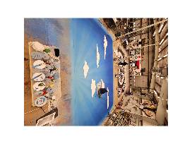 Our scenic artists have generously donated a paint sample from 2025's "White Christmas". The "Blue Skies" drop sample, scenic paint on muslin. 36"h x 30"w