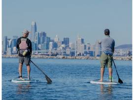 Alameda: Located on an island in San Francisco Bay's East Bay, Alameda offers a calm, peaceful place to paddle while also taking in sweeping views of the downtown San Francisco Skyline, the Bay Bridge, Treasure and Yerba Buena Islands. Air and water temperatures in this part of the Bay also tend to be 5 to 10 degrees warmer than other parts of the Bay making this an ideal place for beginners. Paddlers can easily access Alameda's Crown Beach with its 2.5 miles of calm sandy beach.
