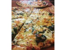 A central feature of the bakery is their daily-special vegetarian pizza. Only one variety is offered each day, and customers line up for fresh slices or whole pies.