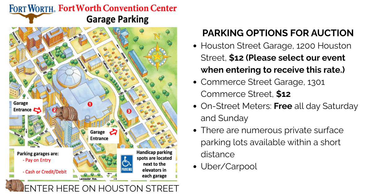 The Houston Street parking garage is directly across the street from the FWCC. Parking in the Houston Street parking garage is $12 or street parking is free on the weekends. Use the 12th street entrance, the one with the Cowboy Hat Star. Once you enter take the escalators up to the second floor, room 202 is immediately to the left of the escalators.