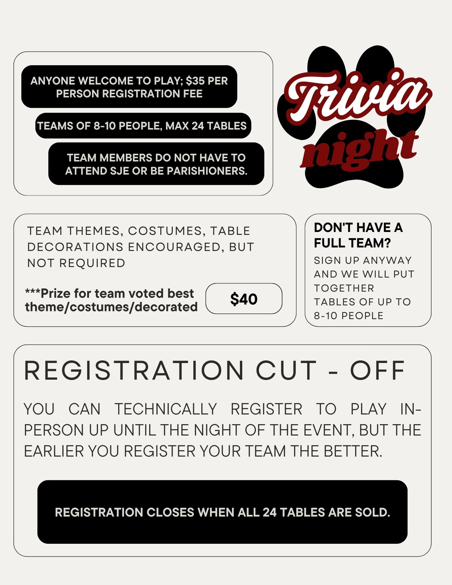 Registration is first come, first served, and spots fill up fast! Tables close once all 24 are sold. You can technically register the night of, but early sign-ups really help with planning.