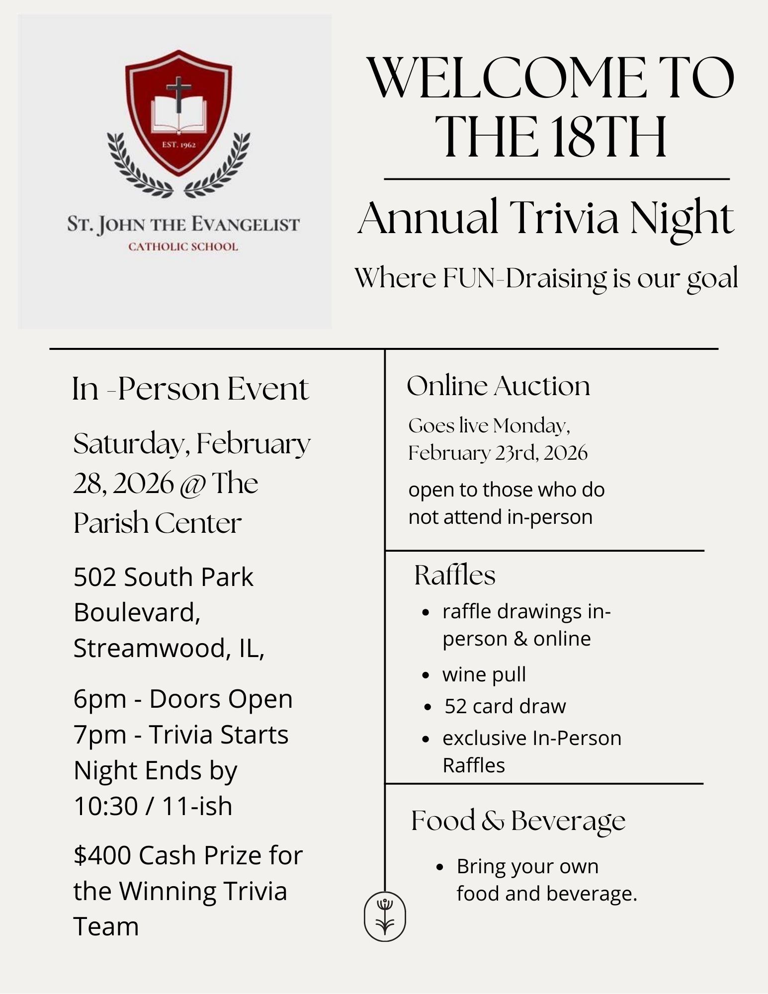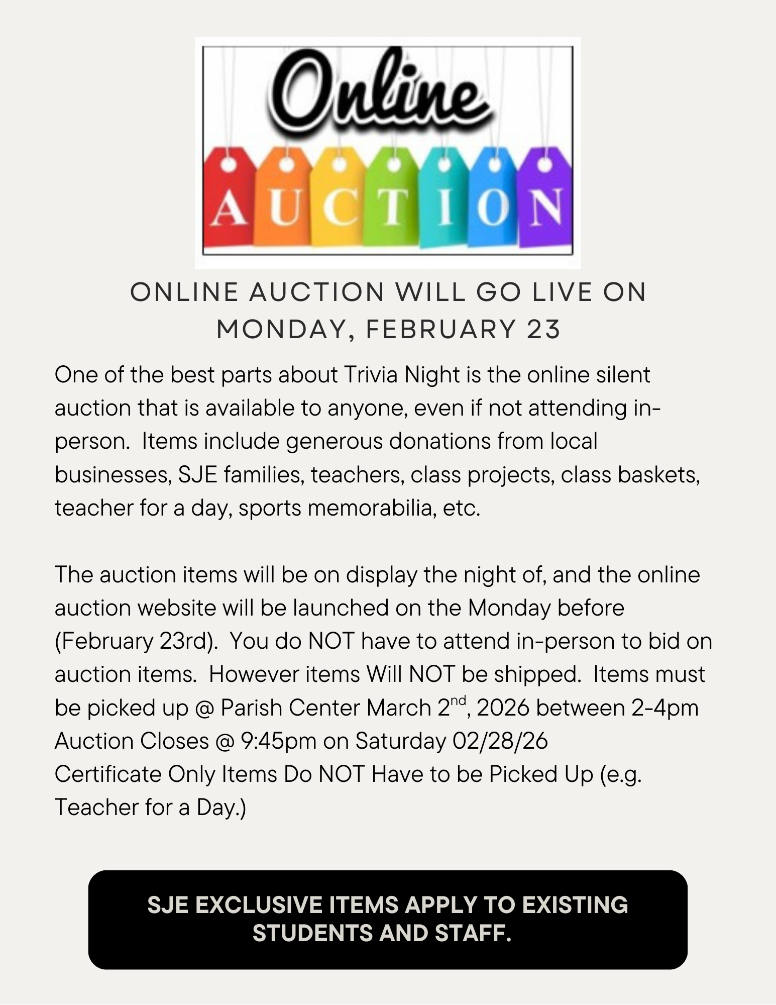 Winners not attending in person must pick up their items at SJE on Monday, March 2nd (2-4 PM) or send a local contact.