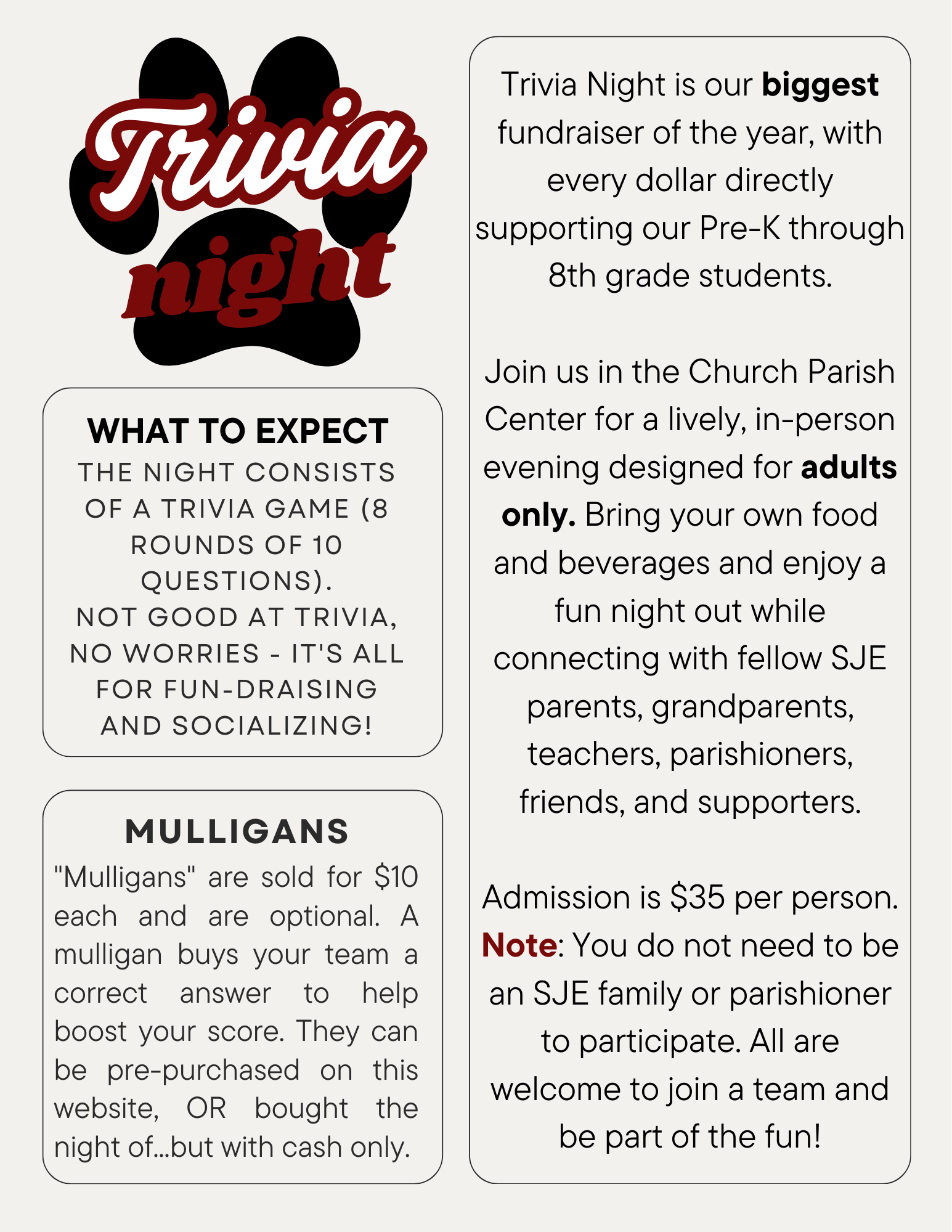 Keep scrolling to FAQs or contact: Tricia Ames - tricia.sjetrivia@gmail.com