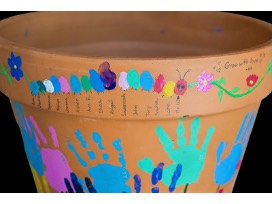 The kindergarten class has created a vibrant oversized flower pot, bursting with creativity and color! Each flower is made from the handprints of the students, and a playful caterpillar is formed from their fingerprints. This charming, heartfelt creation is a beautiful way to bring a touch of childhood imagination and joy into your home or garden.