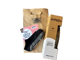 The Good Place, Athletic Reformer Studio at Uncommons includes a 5-pack of reformer pilates, a Mizu stainless water bottle and grip socks size S/M. Also included is certificate for 1-regular size farm box from Farm Fresh To You and 3-$10 gift cards to Foxtail Coffee Co.