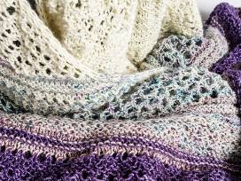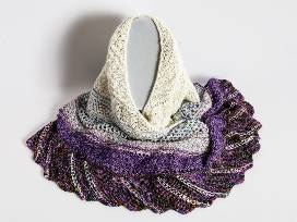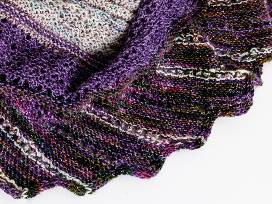 Cresent shaped and approximately 7' tip to tip, using a Stephen West pattern. The purple and cream figers consist of merino, Stellina and nylon. Hand wash in cold water, lay flat to dry