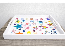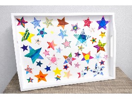 This bamboo serving tray with handles was created by Ms. Uitenbroek's 5th grade class.