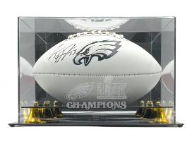 This Philadelphia Eagles logo football has been hand-signed by Cooper DeJean and displayed in a protective case.