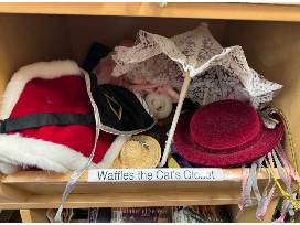 One lucky winning bidder will be the official stylist for the Lower School's beloved library cat, Waffles, for one entire school year (February 2026 - February 2027). Waffles has a closet of themed clothing in the library, and your child will be responsible for outfitting her as needed.