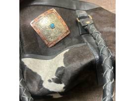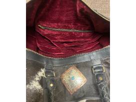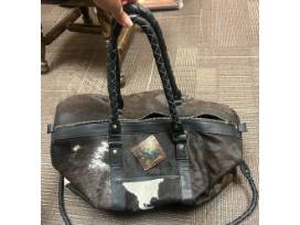 Beautiful cowhide Rowdy Rose duffle bag with red velvet interior, twisted leather straps, and buckle detail.