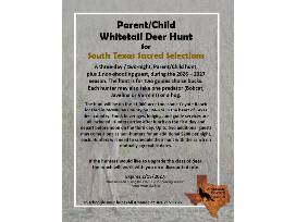 Experience an unforgettable South Texas adventure with this 3 day/2 night Parent/Child Whitetail Deer Hunt at the renowned 11,000 acre Lonesome Coyote Ranch in McMullen County. This package includes two guides-choice bucks, plus each hunter may take one predator or hog. Food, beverages, lodging, and full guide services are all included for two hunters and one non-shooting guest. Additional non-hunters may join for $200 per night. Hunters arrive after lunch on Day 1 and depart before noon on Day 3. Hunt must be scheduled on mutually agreeable dates during the 2026-2027 season. Upgrades available at discounted rates.
