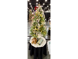 4 ft tree decorated with champagne-colored bulbs, vintage jewelry pieces, and faux candles. Has a white embellished tree skirt.