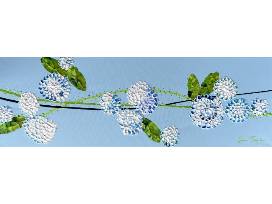 Still We Bloom. 36 x 12 Set against a light blue field, flowing green lines move across the canvas, carrying clusters of hydrangea blossoms in soft whites and blues. The composition reflects continuity, care, and collective strength - a reminder that even amid challenge, growth persists. Still We Bloom celebrates resilience, hope, and the enduring beauty of standing together.