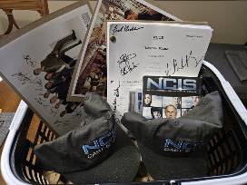 Basket includes a cast member signed script; 2 cast member signed photographs; the official NCIS soundtrack; an official NCIS video; and 2 NCIS 'Cast & Crew" ball caps