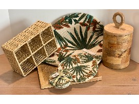 Set Includes : 12" Square Wooden Tray, Round Wooden Canister With Lid, 6 Compartment Woven Utensil Tray, Palm Frond Table Runner, Coasters And 2 Trivets