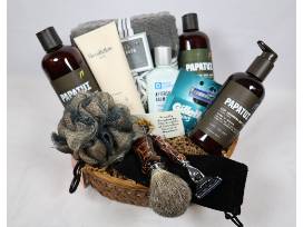Parishioner Lou Meyer turned the beautiful copper shimmer brush and razor set. Men's Papatui products include one (1) each 18 oz Nourishing Shampoo + Conditioner in Cedar Sport scent, 18 oz Refreshing Body Wash in Sandalwood Suede, and 11.5 Fast Absorbing Body Lotion in Lush Coconut. Other products include 6.5 oz Goodfellow & Co Shave Cream in Mint & Cedar Scent and 6 oz Duke Cannon Supply Co alcohol-free Aftershave Balm. Gillette Mach four (4) cartridge refills, 6-pack Novo 13" x 13" gray and white Bath Wash Cloths, and gentle exfoliating Bath Sponge included.