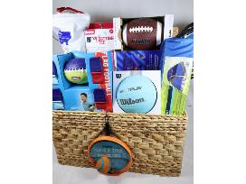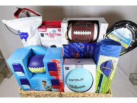 A large 2' x 13" x 13" hand woven trunk with handles is filled with outdoor family fun including Badminton Racket Set, Kid's baseball chair, Franklin Batting Tee, Franklin Throw n' Stick, Go For It game, Wilson blue volleyball, Franklin football, two (2) person kid's tent, Little Tikes flag football set, and Academy frisbee.