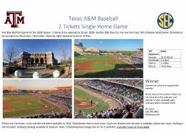 Certificate is good for two (2) Texas A&M baseball tickets to one (1) Blue Bell Park game for the 2026 Season. Game should be selected by January 15, 2026. Seats are located in Section 209, Row 13: one row from top in shade; elevator is available, down two steps. SEC schedule is listed below but should be complete by November / December. Opening night is expected to be on February 13, 2026. Tickets are electronic, to be transferred when available in 2026.