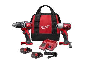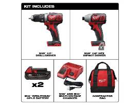 The Milwaukee M18 Cordless Lithium-Ion 2-Tool Combo Kit includes the M18 Compact Drill/Driver (2606-20) and M18 1/4 in. Hex Impact Driver (2656-20). The M18 cordless system's patented technologies and electronics, innovative motor design, and superior ergonomics provide users with the most efficient blend of power, weight, and performance in its class. The compact drill/driver and impact driver are powered by Milwaukee REDLITHIUM CP1.5 lithium-ion batteries, delivering more torque, more power, and longer run-time than the competition. The kit includes one M18 Compact Drill/Driver (2606-20), one M18 1/4 in. Hex Impact Driver (2656-20), two compact REDLITHIUM CP1.5AH lithium-ion batteries, an M18/M12 Multi-Voltage charger, a belt clip, and a contractor bag.