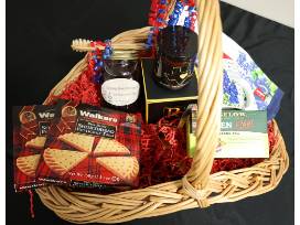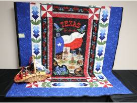 This beautiful, handmade Texas-themed quilt measures 62" x 82"! Accompanying basket includes Lavender/Sage Soy candle, Spring Bee Honey Co. raw local honey, honey dipper, bluebonnet coffee mug, Texas dish towel, Green Chai Tea, Lone Star copper cookie cutter, and two (2) 5.3 oz Walker's Shortbread.