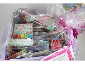 This 16" x 21" x 11" toy tote with handles and wheels is full of a starter kit for a girl's birthday party for 16. One (1) each (unless specified) tiara, Happy Birthday award ribbon, 16 party crackers, photo backdrop with props, 50 swirl decorations, decorative backdrop, 6 (six) confetti balloons, birthday centerpiece, Happy Birthday banner, 40 elegant pink plates, 2 pink party table covers, 52 party napkins, 25 party cups, 16 pink forks and spoons, 20 pink knives, and Happy Birthday candle. There's also 16 treat bags to fill with 18 bottles of bubbles, 24 color-your-own crowns, 16 multi-colored pencils, 24 fun erasers and 16 party rings.