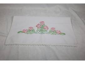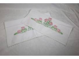 These two (2) hand embroidered pillow cases with lace have a pink tulip design and measure 29" x 20.5" each.