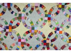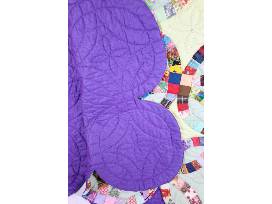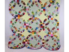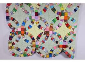 Many hours of love and patience went into making this handmade 89" x 71" quilt in pale yellow and mint green colors with a purple backing. Rings are made of multi-colored and multi-patterned squares.