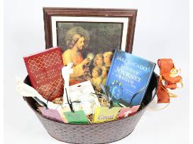 16" x 8" metal basket with handles holds a vintage 8" x 10" picture of Jesus administering the Holy Eucharist to children, a "Pocket Guide to the Sacrament of Reconciliation" donated by Ascension Press, Max Lucado's "Let the Journey Begin - Finding God's Best for Your Life" hardcover, a couple of angel statues, four (4) bookmarks, The Celestial Five Angel pins for protection and guidance, plus two (2) votive holders with candles.
