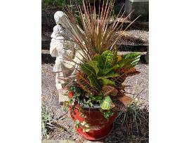 Large 12" diameter reddish brown heavy ceramic style planter with a Ready Refill planter from Lowe's; Planter has Flax Lilly, Croton, and variegated Asiatic Jasmine plush one (1) $25 Lowe's gift card.