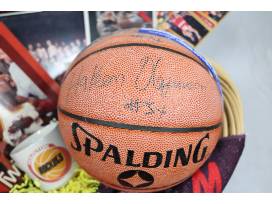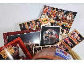 Official NBA Olajuwon signed basketball, sports cards, photograph of past Rocket's team, Olajuwon towel, and Sports Illustrated Special Collected Twice as Nice Rocket's season.