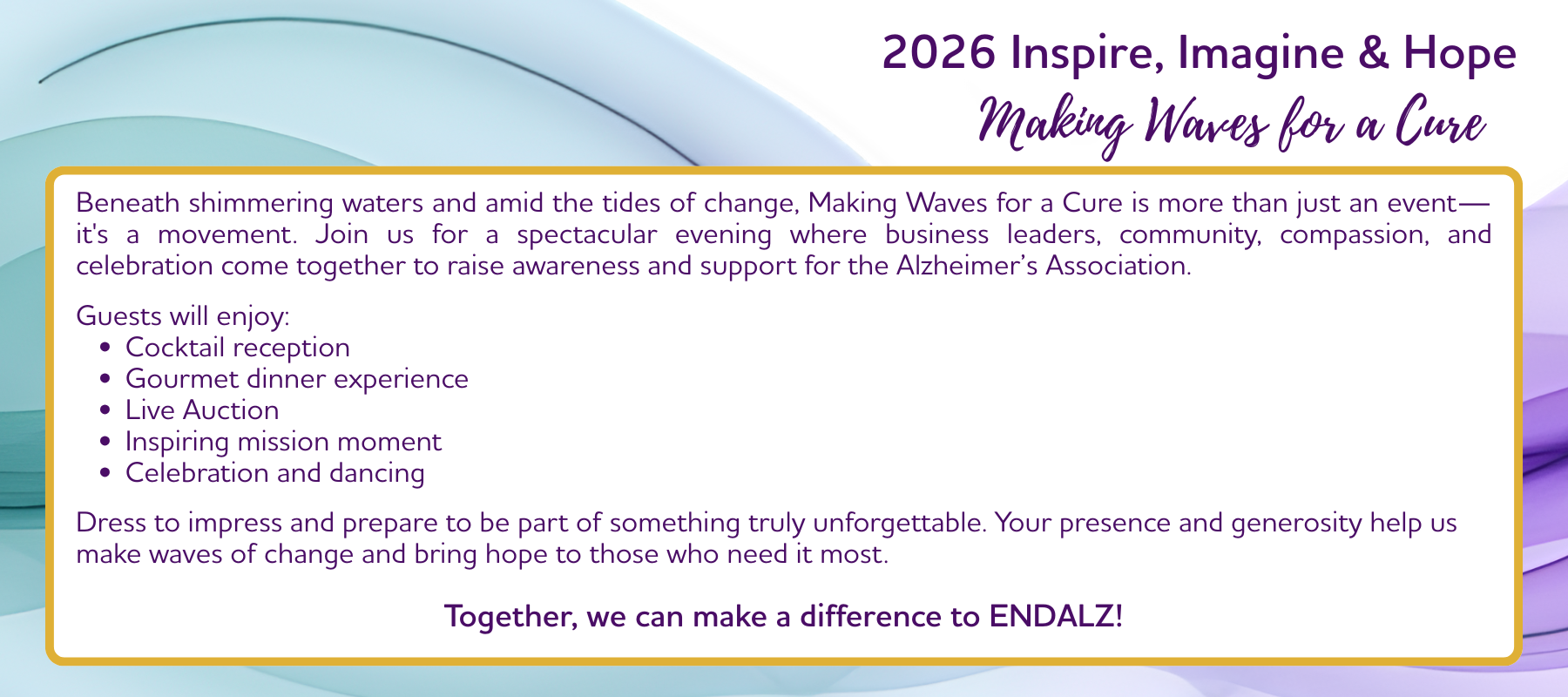 Every ripple starts with a single drop. This year we are Making Waves for a Cure, we believe that together, we can create a tidal wave of hope for those battling Alzheimer's and all other dementia.