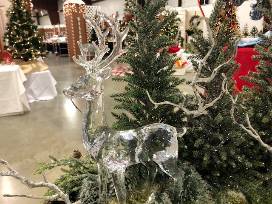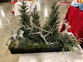 Black metal tray with frosted trees, acrylic deer, and white sticks. 29" W by 20" D by 20" H