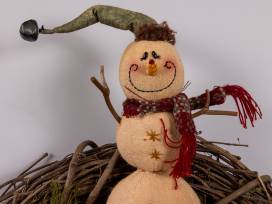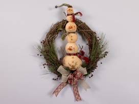 26" grapevine wreath with greens, berries, tower of snowmen, and multi-ribbon bow