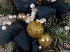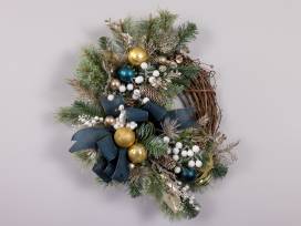 19" grapevine wreath with greens, blue and gold baubles, berries, and pinecones