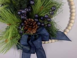 17" wooden bead wreath with assorted greens, blue berries, pinecones, and blue bow