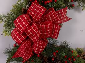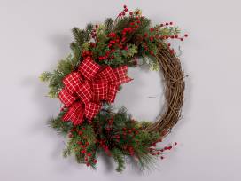 25" grapevine wreath assorted greens, red berries, and red woven ribbon