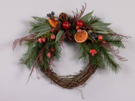 27" grapevine wreath with greens, leaves, and assorted fruit