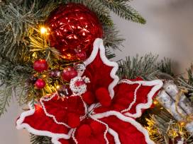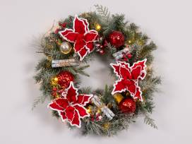 32" green wreath with red and white poinsettias, red and silver balls, birch thicks, snowy berries, and battery lights