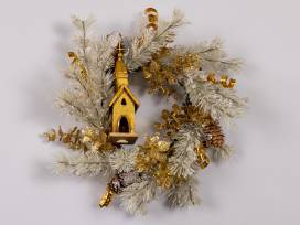 12" snowy wreath with gold church and gold picks