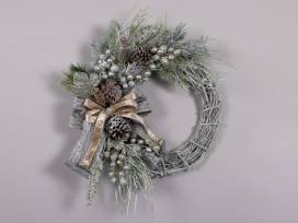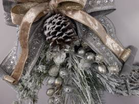 30" silver glitter grapevine wreath with snowy greens, silver grapes, snowy pinecones, and multi-ribbon gold and silver bow