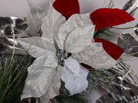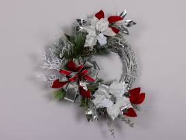 32" silver grapevine wreath with snowy greens and branches, white poinsettia, and red and silver bow
