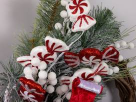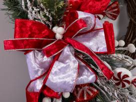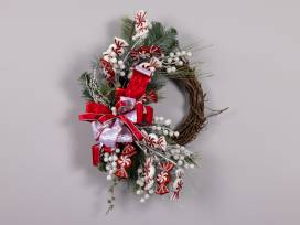 26" grapevine wreath with assorted greens, berries, snowy sticks, candy picks, and red and white bow