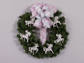18" green wreath with pink and lavender carousel horses and a festive bow